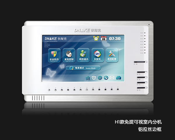 H1款免提可視室內(nèi)分機機殼采用ABS防火材質(zhì)打造,耐熱更強,更具輕盈之感;鋁拉絲面板賦予表面,柔美線條彰顯貴族氣息;7寸大屏液晶顯示,中文菜單提示,精美操作界面與親切操作界面融合,更顯人性理念。