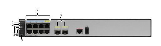 AC6005-8-PWR產品正面面板的指示燈相對于AC6005-8,多1個PoE指示燈,其他相同。外觀圖以AC6005-8-PWR舉例說明。