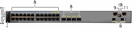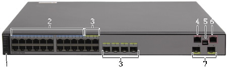 24個GE電接口:端口從1開始編號,從下到上,從左到右。 光接口:請參考三角形狀的箭頭指向。 |